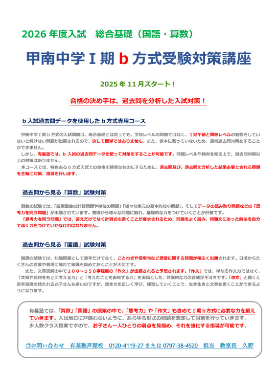 有基塾【2026年度 甲南中学Ⅰ期b入試対策講座】